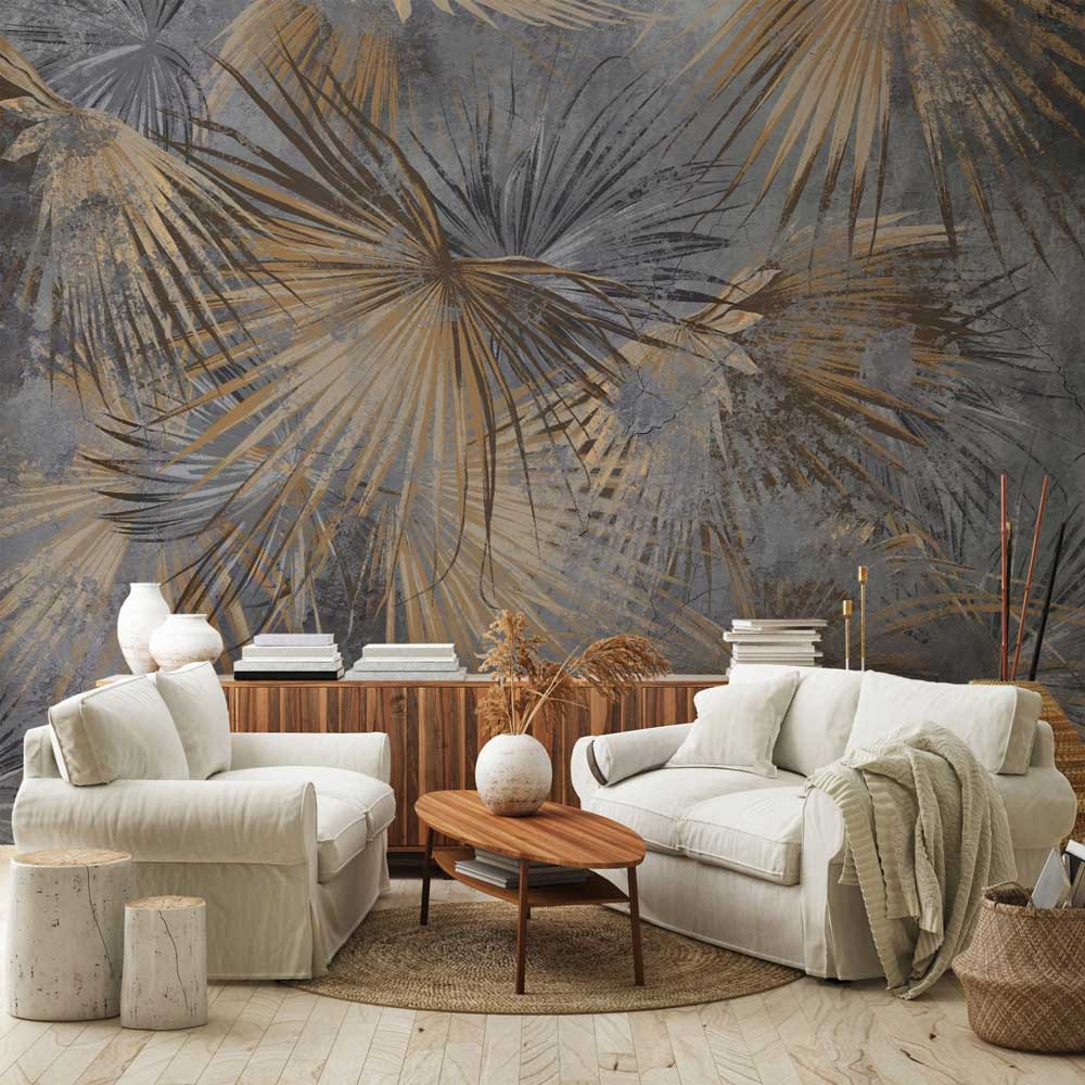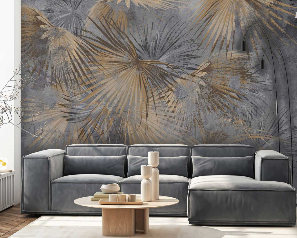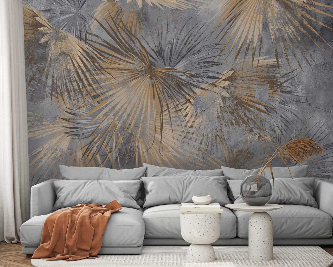 Aranyszínű pálmalevél mintás vlies fotótapéta szürke beton alapon 400x280cm