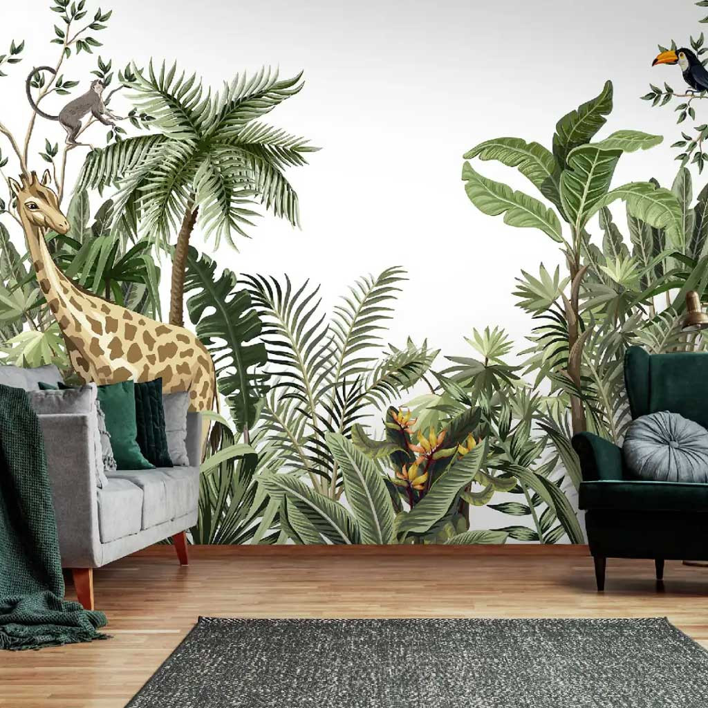 Fedezd fel a dzsungel varázsát otthonodban! A zsiráf, makimajom és a színes tukán madár egy trópusi paradicsom világát idézik meg, ahol a pálmafák és a buja trópusi levelek életre kelnek. Tökéletes választás, ha egzotikus, természetközeli hangulatot szeretnél teremteni.