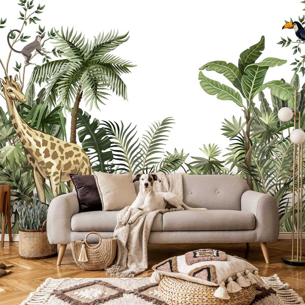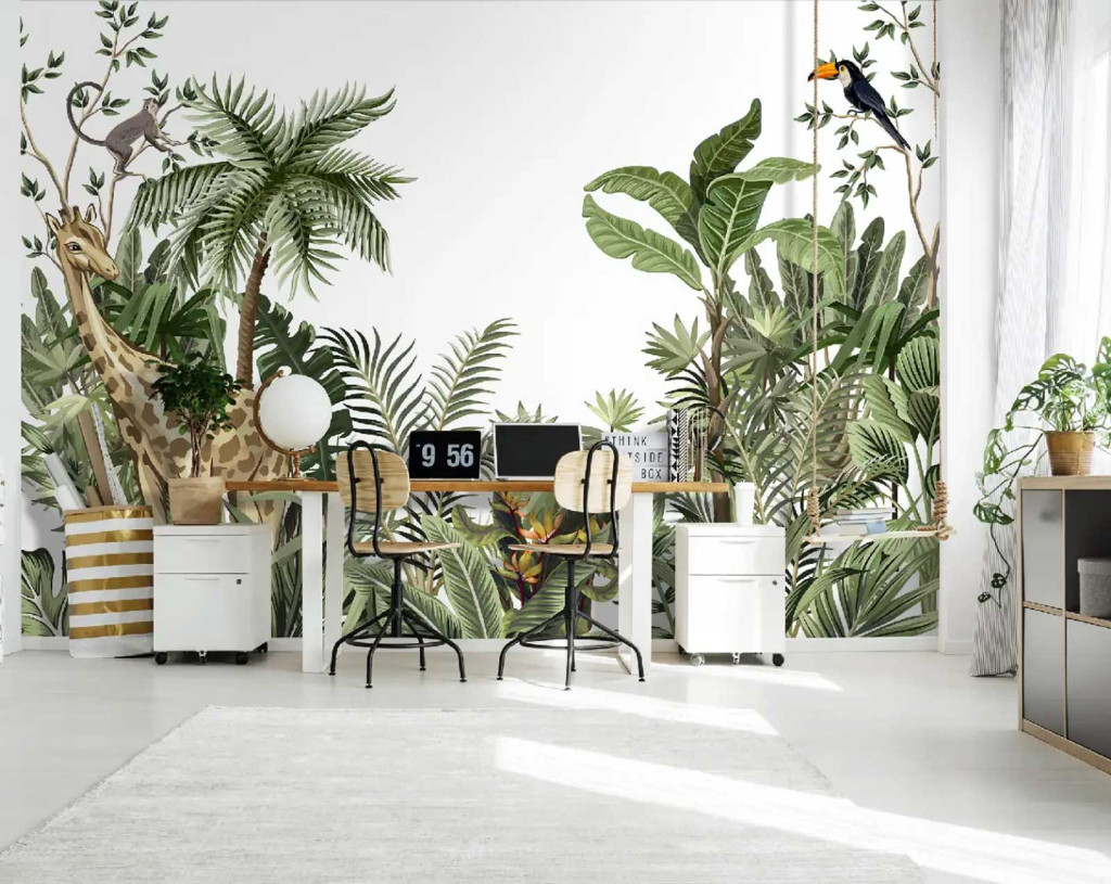 Fedezd fel a dzsungel varázsát otthonodban! A zsiráf, makimajom és a színes tukán madár egy trópusi paradicsom világát idézik meg, ahol a pálmafák és a buja trópusi levelek életre kelnek. Tökéletes választás, ha egzotikus, természetközeli hangulatot szeretnél teremteni.
