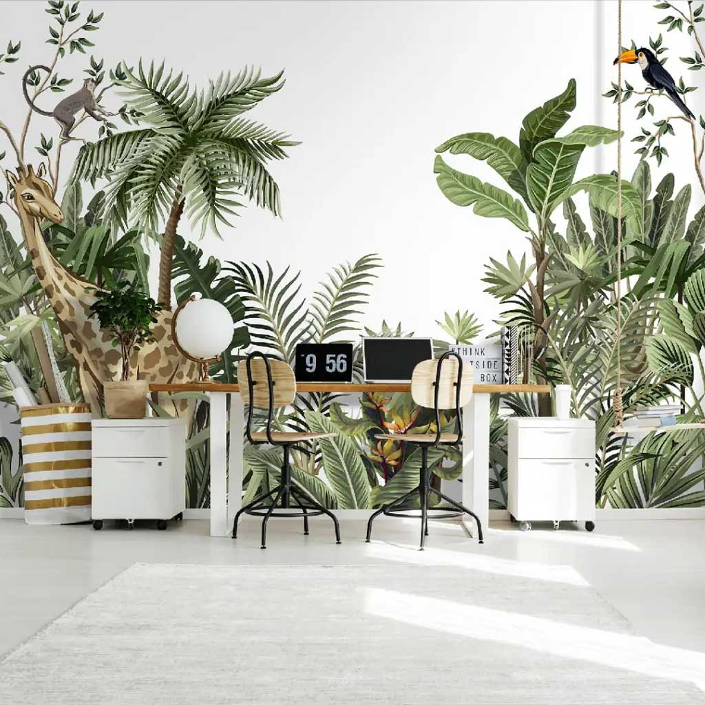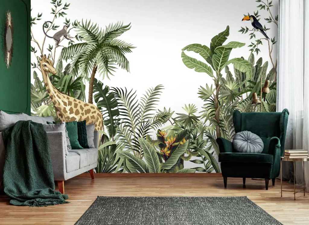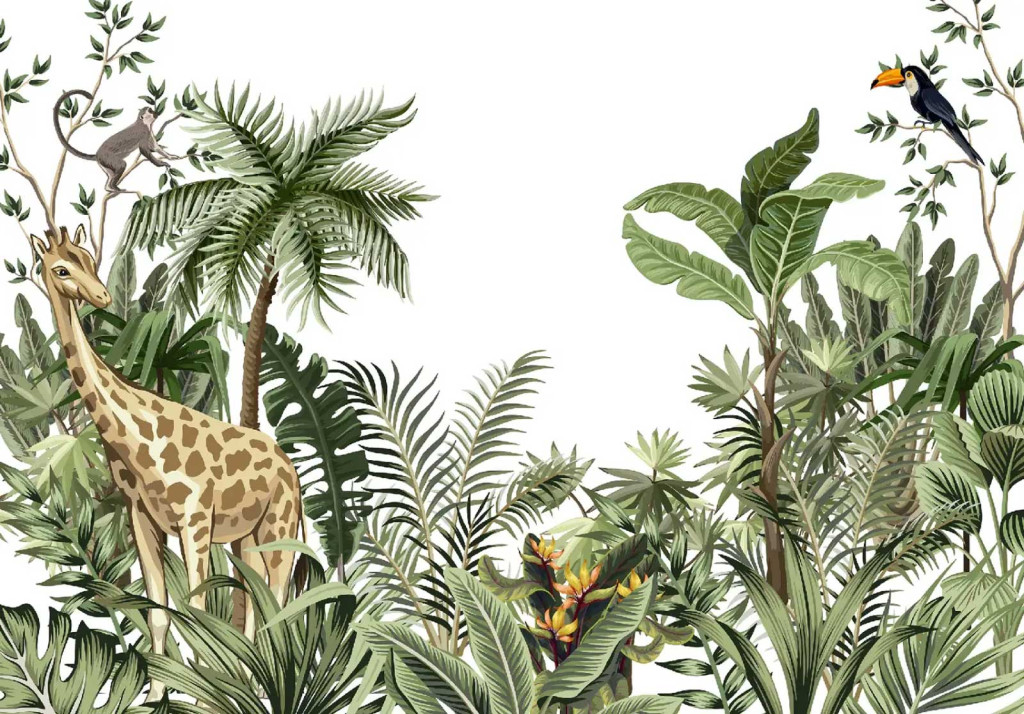 Fedezd fel a dzsungel varázsát otthonodban! A zsiráf, makimajom és a színes tukán madár egy trópusi paradicsom világát idézik meg, ahol a pálmafák és a buja trópusi levelek életre kelnek. Tökéletes választás, ha egzotikus, természetközeli hangulatot szeretnél teremteni.