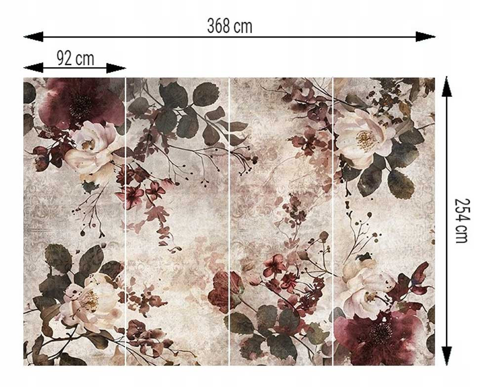 A kép 368 cm széles és 254 cm magas - 4 db 92x254 cm-es részből áll. A csomag tartalmazza a felrakási útmutatót és a tapétaragasztót.