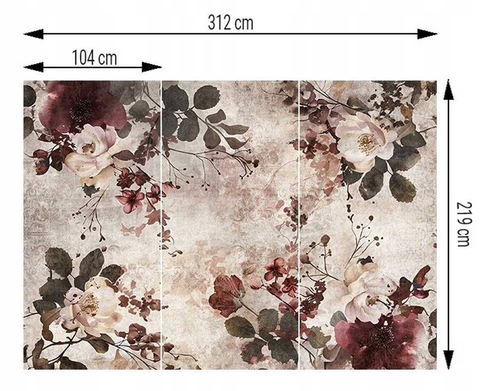 A kép 312 cm széles és 219 cm magas - 3 db 104x219 cm-es részből áll. A csomag tartalmazza a felrakási útmutatót és a tapétaragasztót.